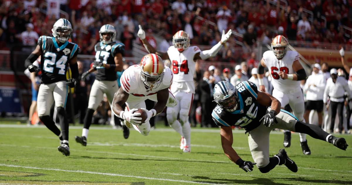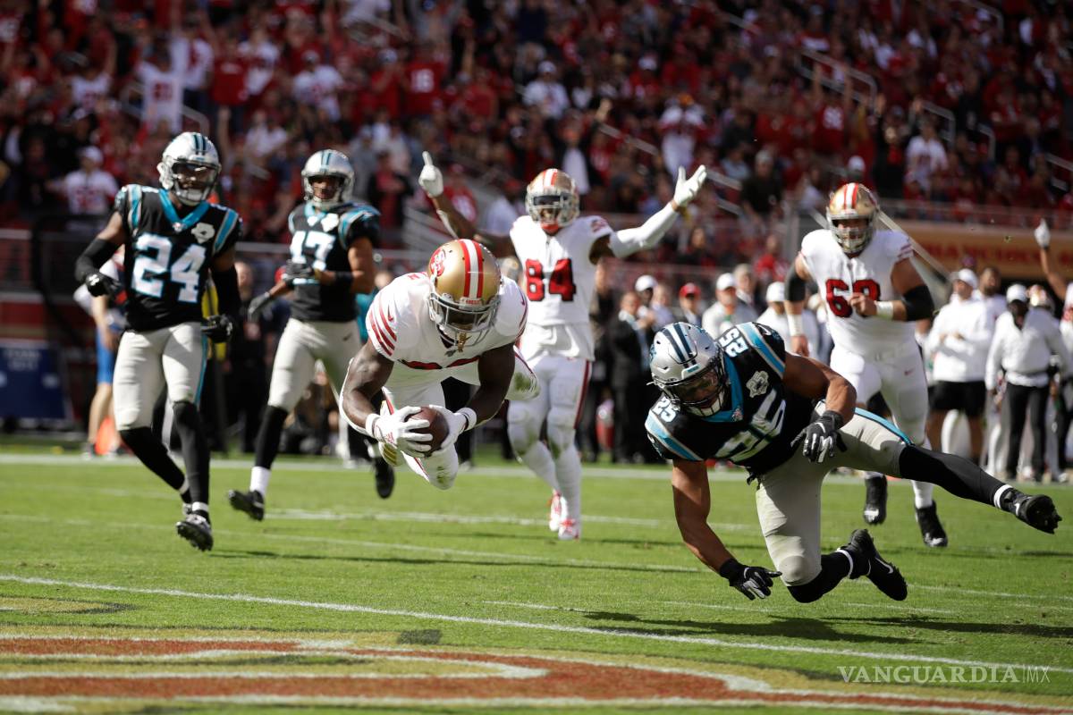 SANTA CLARA.- Tevin Coleman anotó tres de sus cuatro touchdowns en la primera mitad, el novato Nick Bosa logró tres capturas y una acrobática intercepción y los 49ers de San Francisco mantuvieron el invicto, al apabullar 51-13 a los Panthers de Carolina.