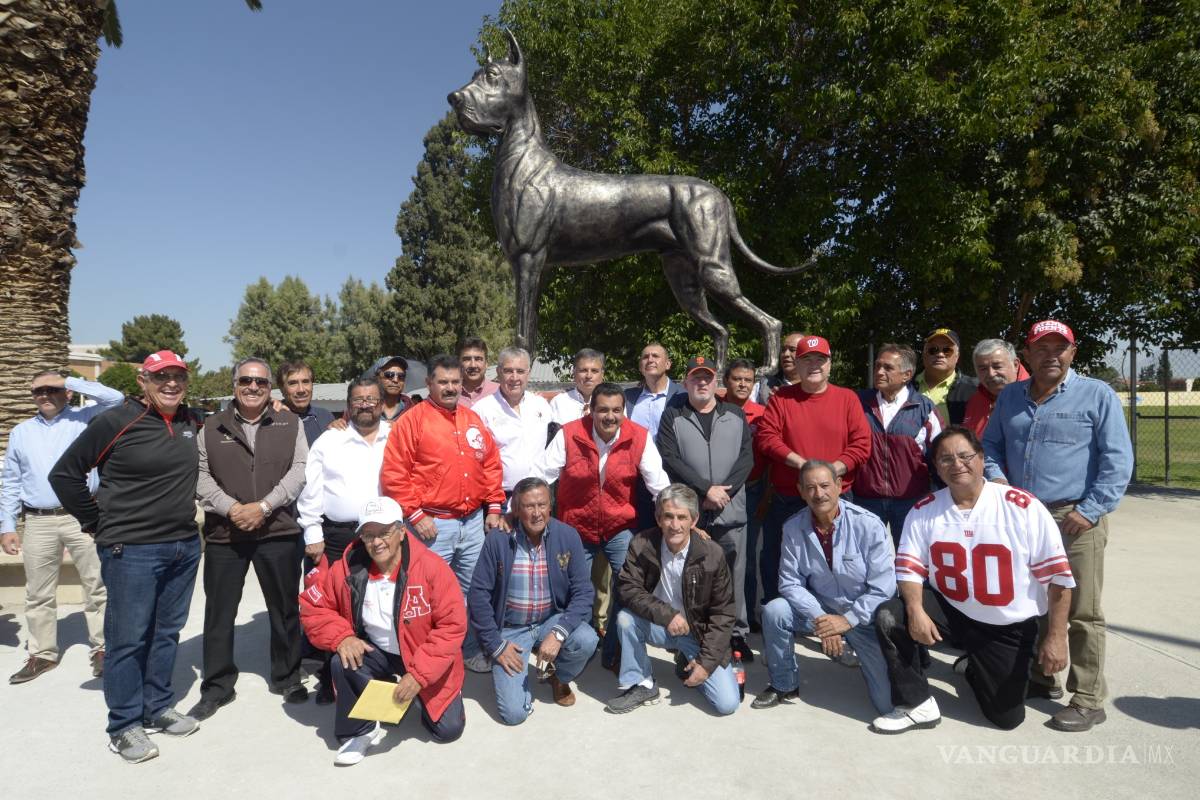 Justo en la entrada al emparrillado del Campo Juan Lobato se levantó el monumento del Gran Danés, y al rededor de él se congregaron jugadores, exjugadores, autoridades del Ateneo y la Universidad Autónoma de Coahuila, para celebrar la inauguración de la estatua, orgullo de los defensores de los colores rojo y blanco.