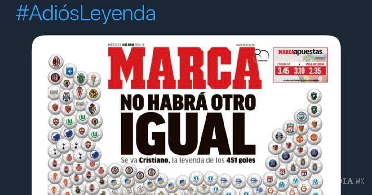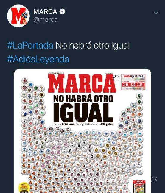 Luego de la salida de Cristiano, Marca decidió hacerle un homenaje colocando en la portada los 451 goles en el Madrid con los logotipos de los equipos a los que les había marcado junto a la cabeza: "No habrá otro igual".