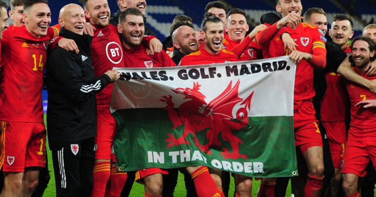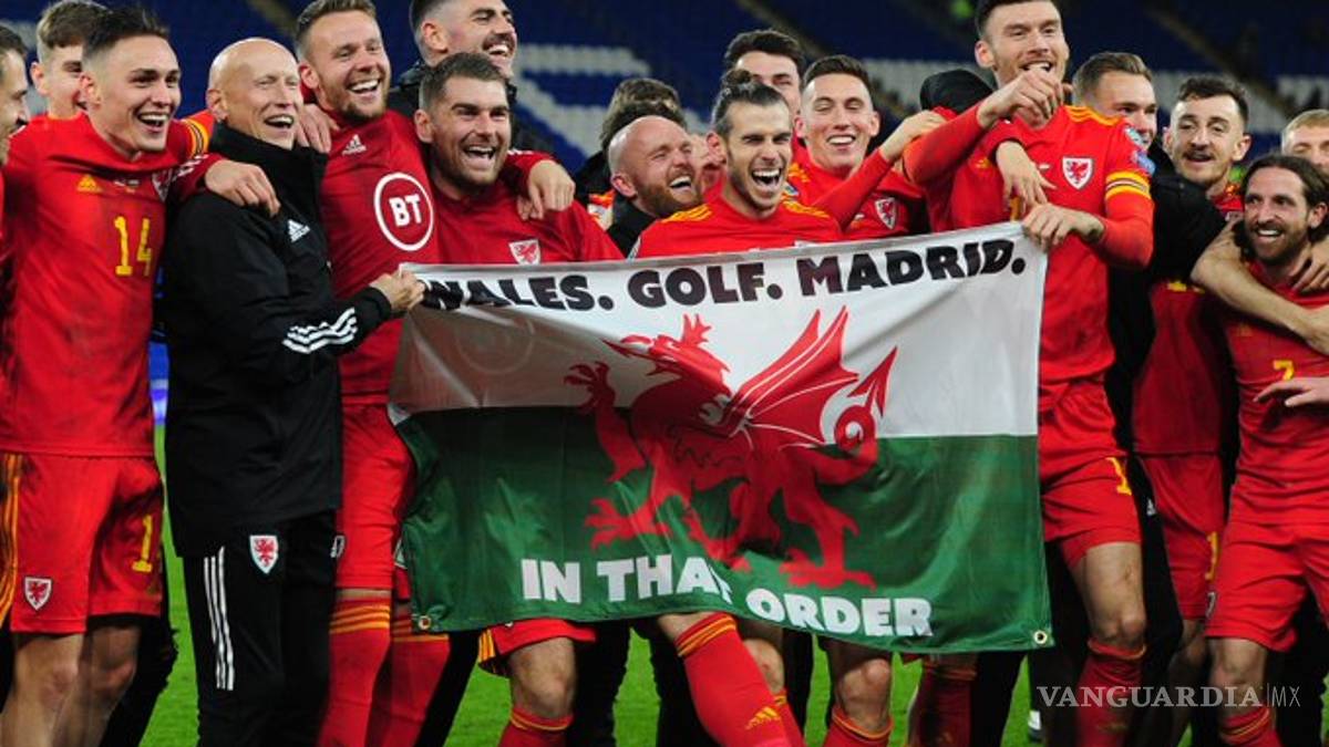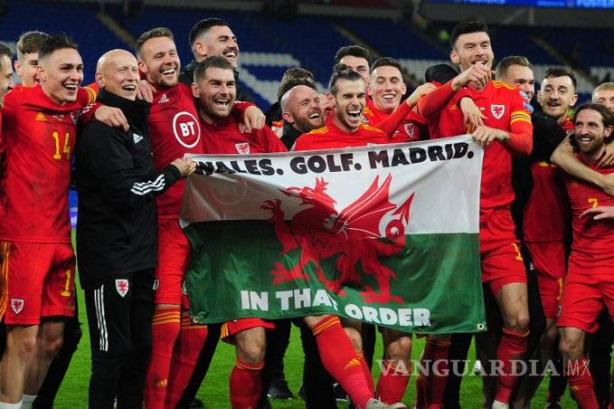 Gareth Bale celebró la clasificación de Gales para la Eurocopa junto a sus compañeros de selección posando tras una bandera del país con el lema "Gales. Golf. Madrid. En ese orden", un mensaje que la afición galesa ha transformado en canción y que el jugador definió como "un poco de diversión".