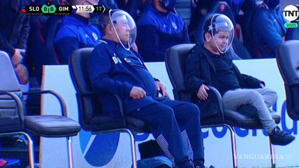 Diego Armando Maradona se tuvo que adaptar a la nueva normalidad y para un partido amistoso entre su equipo, Gimnasia y Esgrima, ante San Lorenzo, apareció con una careta similar a la de un astronauta.