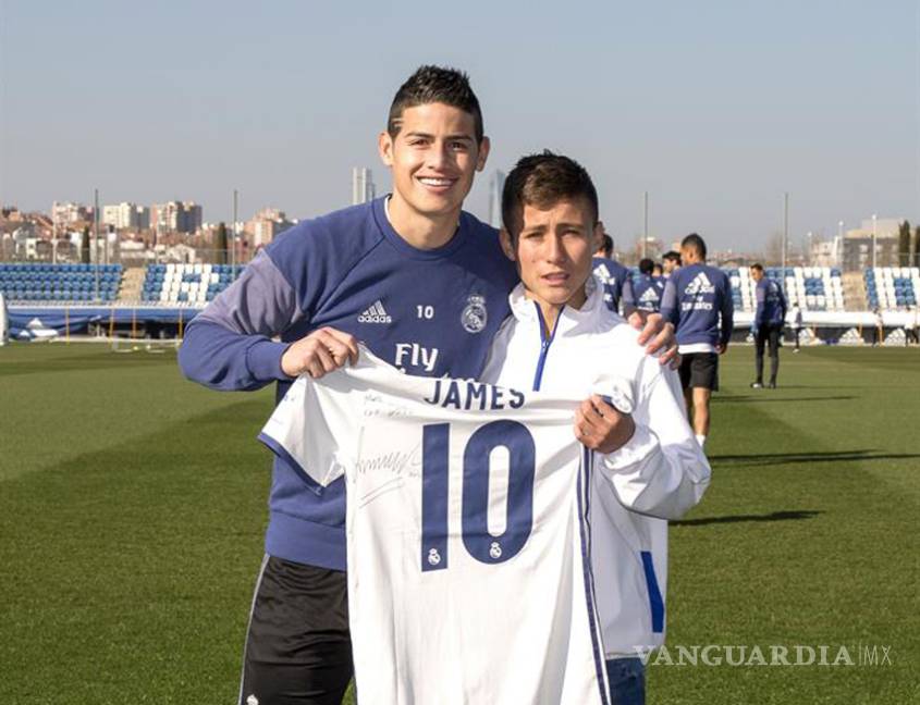 Para el joven colombiano fue muy emotivo el momento del encuentro con su compatriota James Rodríguez, gran figura de la selección sudamericana, quien le dio un abrazo muy cariñoso antes de posar para la fotografía y que le regaló