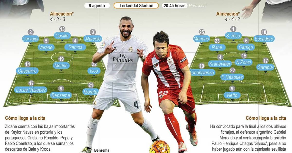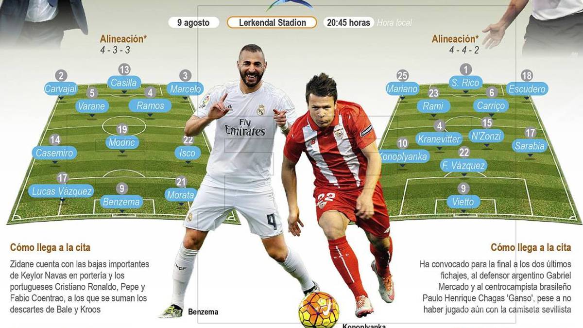 La gran duda de Zidane es ver si podrá contar con el francés Karim Benzema, quien todavía no jugó un minuto durante los amistosos de pretemporada por molestias en una cadera. Lo único seguro es que Álvaro Morata, todavía sin marcar en la pretemporada, tendrá un puesto en la delantera.