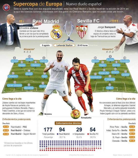 Real Madrid y Sevilla abrirán mañana la temporada oficial de fútbol en Europa con la disputa de una Supercopa llena de incógnitas por el indefinido momento de forma que atraviesan ambos equipos, inmersos todavía en el ecuador de la pretemporada.