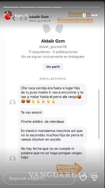 La silbante también publicó una historia en Instagram donde expresó su rechazo a este tipo de violencia, aludiendo a las cifras de asesinatos en México. “En México, un país donde cada día son asesinadas 10 mujeres, 91 personas son asesinadas cada día (hombres y mujeres). No podemos normalizar la violencia. ¡Rechazo total a la violencia en todos los espacios!”, escribió la árbitra.