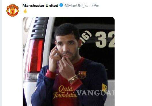 Tal parece que ahora su nueva "víctima" sea el Barcelona. La cuenta de Twitter del Manchester United subió una imagen del rapero con la playera del cuadro blaugrana y los Red Devils tenían unos dedos cruzados haciendo "changuitos" para que los ayude a vencer a Messi y compañía.