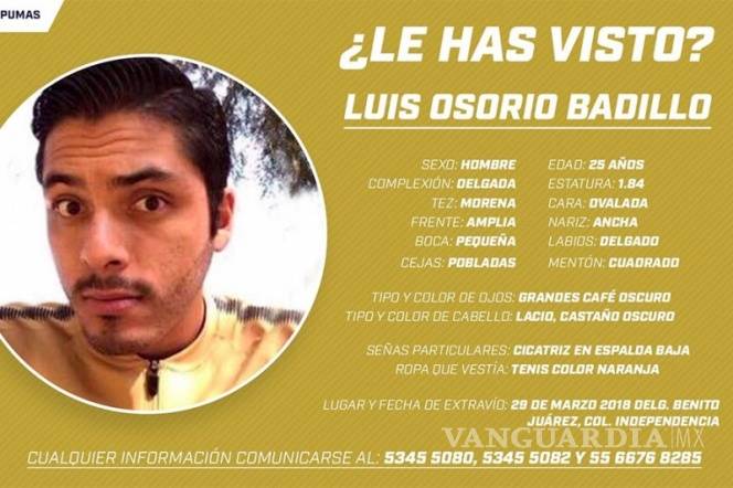 CIUDAD DE MÉXICO.- Por medio de las redes sociales, Pumas solicitó la ayuda de su afición y de la comunidad en general, para dar con el paradero de Luis Osorio Badillo, de sus fuerzas básicas.