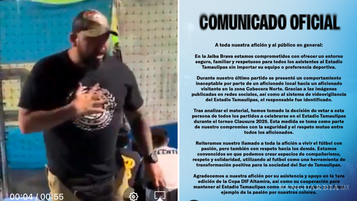 La directiva de la Jaiba Brava de Tampico Madero, equipo de la Liga Expansión MX, anunció el veto de seis meses a un aficionado presuntamente miembro de la barra Terrorizer, tras un incidente ocurrido durante el partido amistoso de la Copa DIF Altamira. El encuentro se llevó a cabo el pasado sábado en el estadio Tamaulipas entre la Jaiba Brava y las Chivas Rayadas de Guadalajara.