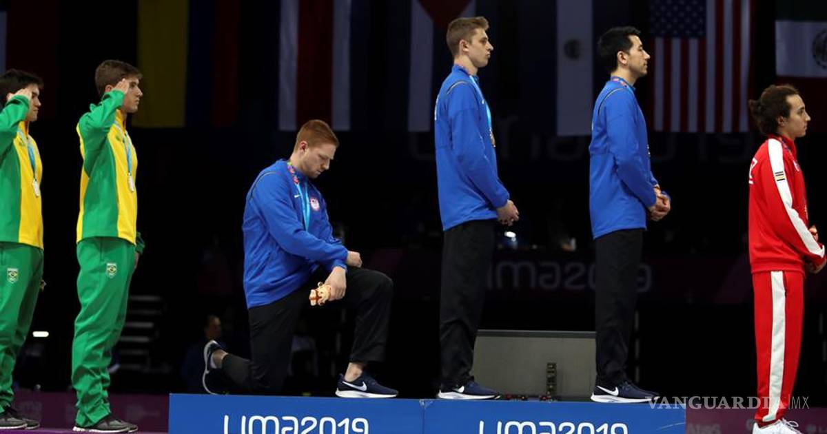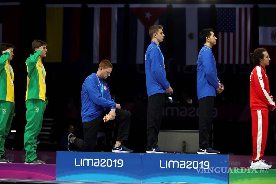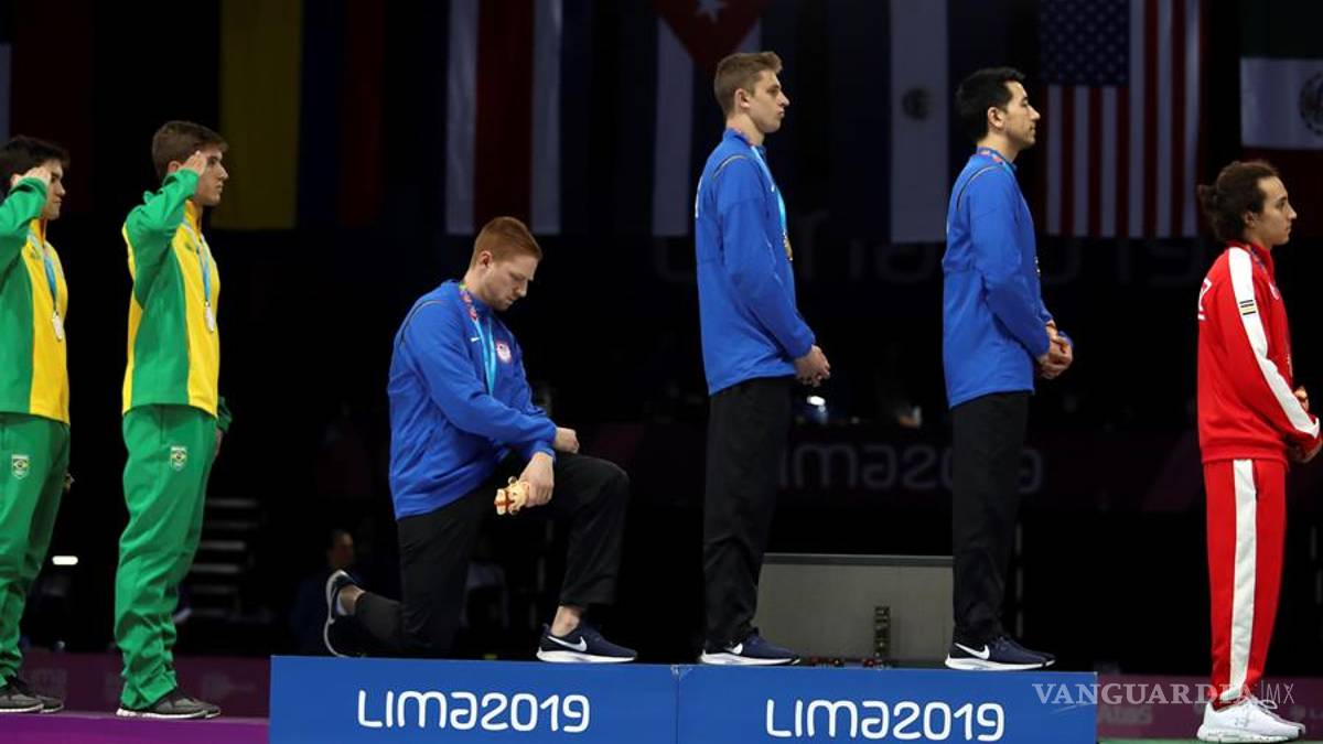 El esgrimista norteamericano, Race Imboden, sorprendió a todos durante la ceremonia de premiación al arrodillarse en manera de protesta durante el himno de Estados Unidos en los Juegos Panamericanos de Lima 2019.