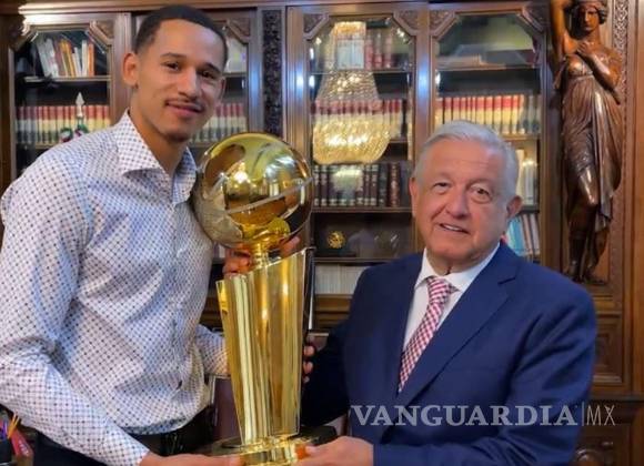 Presume AMLO reunión en Palacio Nacional con Juan Toscano; carga el trofeo de campeón de la NBA