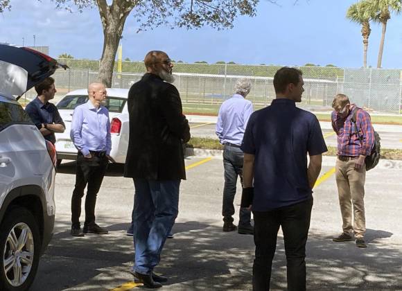 Clark y los jugadores se reunieron con Bruce Meyer, el jefe negociador del sindicato en el estacionamiento del lado del jardín derecho antes de ingresar al parque.