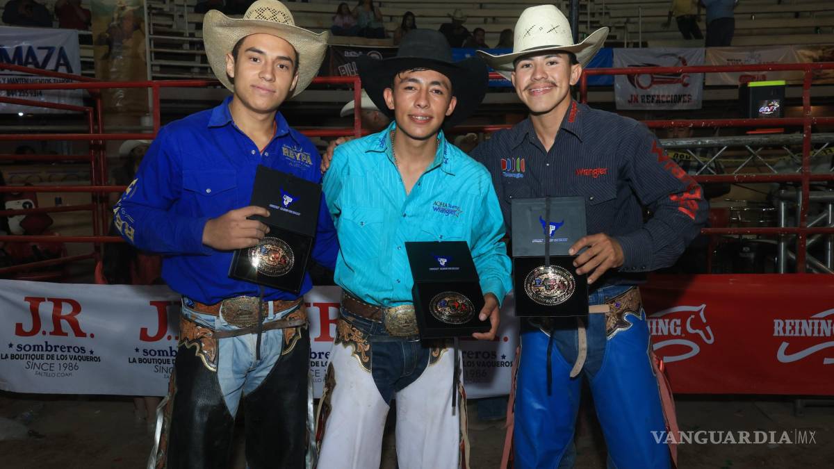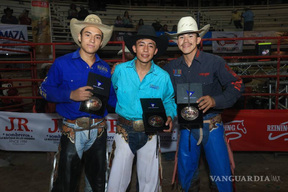 Marcelo Veloz, de Jalisco; Adán Ramírez, de Guanajuato, y el coahuilense Brayan Medina Dávila se llevaron a casa la hebilla de campeón del evento realizado en el Lienzo Charro Profr. Enrique González Treviño.