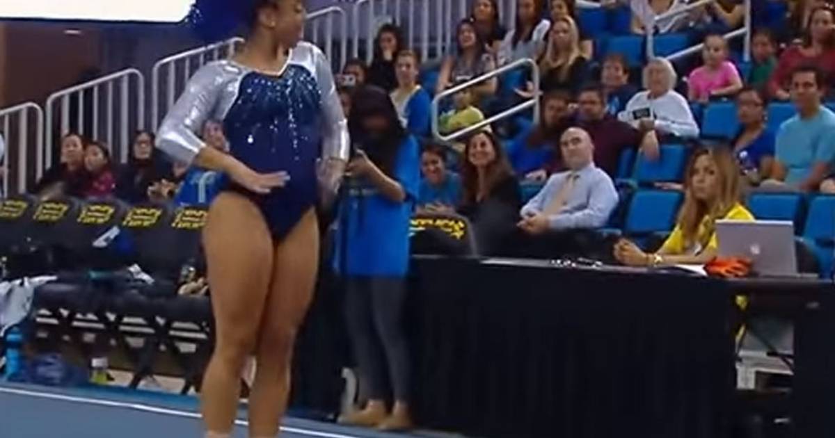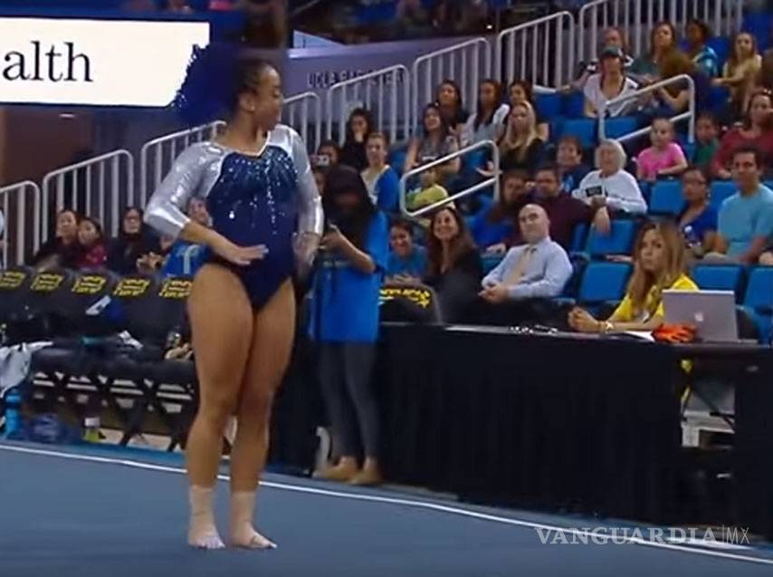 DeJesus fue una de las 5 gimnastas de UCLA que presentaron la rutina de piso que cerró la competencia. Pese a que no alcanzó la mayor calificación, las más de 7 mil personas en el Pauley Pavilion, en Los Ángeles, enloquecieron con el ritmo y las vueltas de la chica.