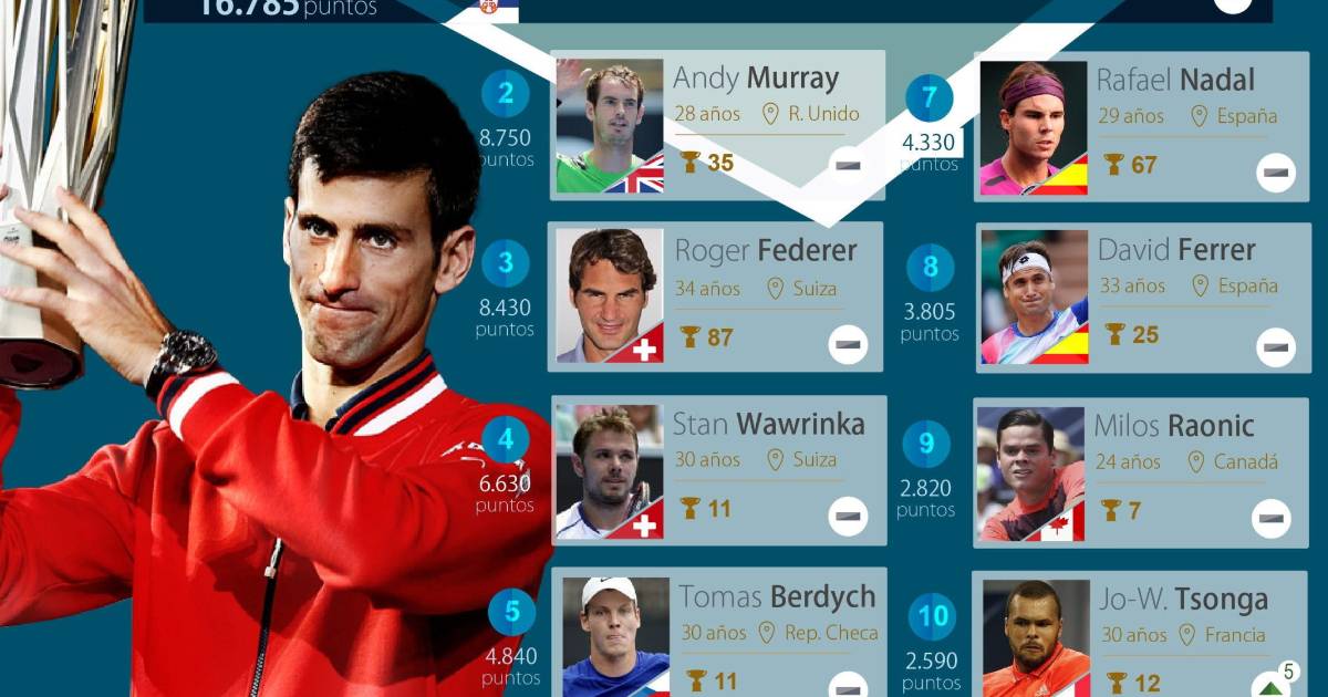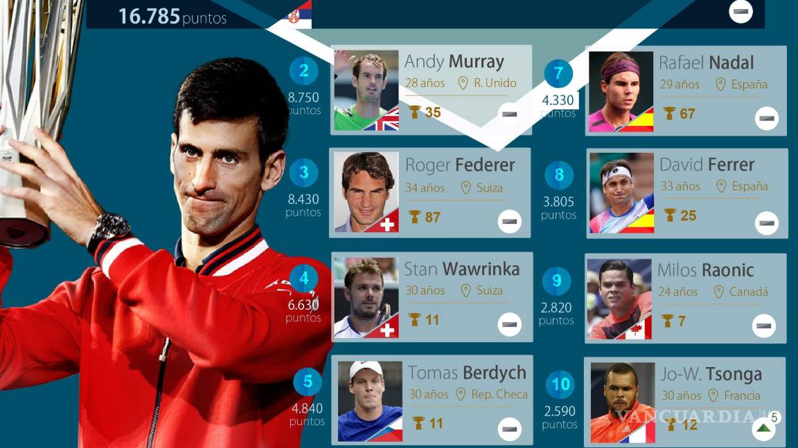 El serbio sacó una diferencia de ocho mil 035 puntos al británico Andy Murray, raqueta número dos del mundo, quien cuenta con ocho mil 750 unidades, mientras que el suizo Roger Federer mantiene el tercer lugar con ocho mil 430.