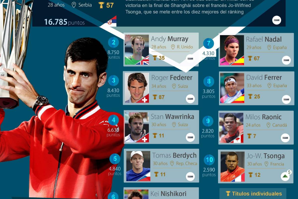En tanto, el francés Jo-Wilfried Tsonga, quien perdió la final en el torneo de Shanghái, se colocó dentro del Top 10, desplazando al sudafricano Kevin Anderson al undécimo puesto.