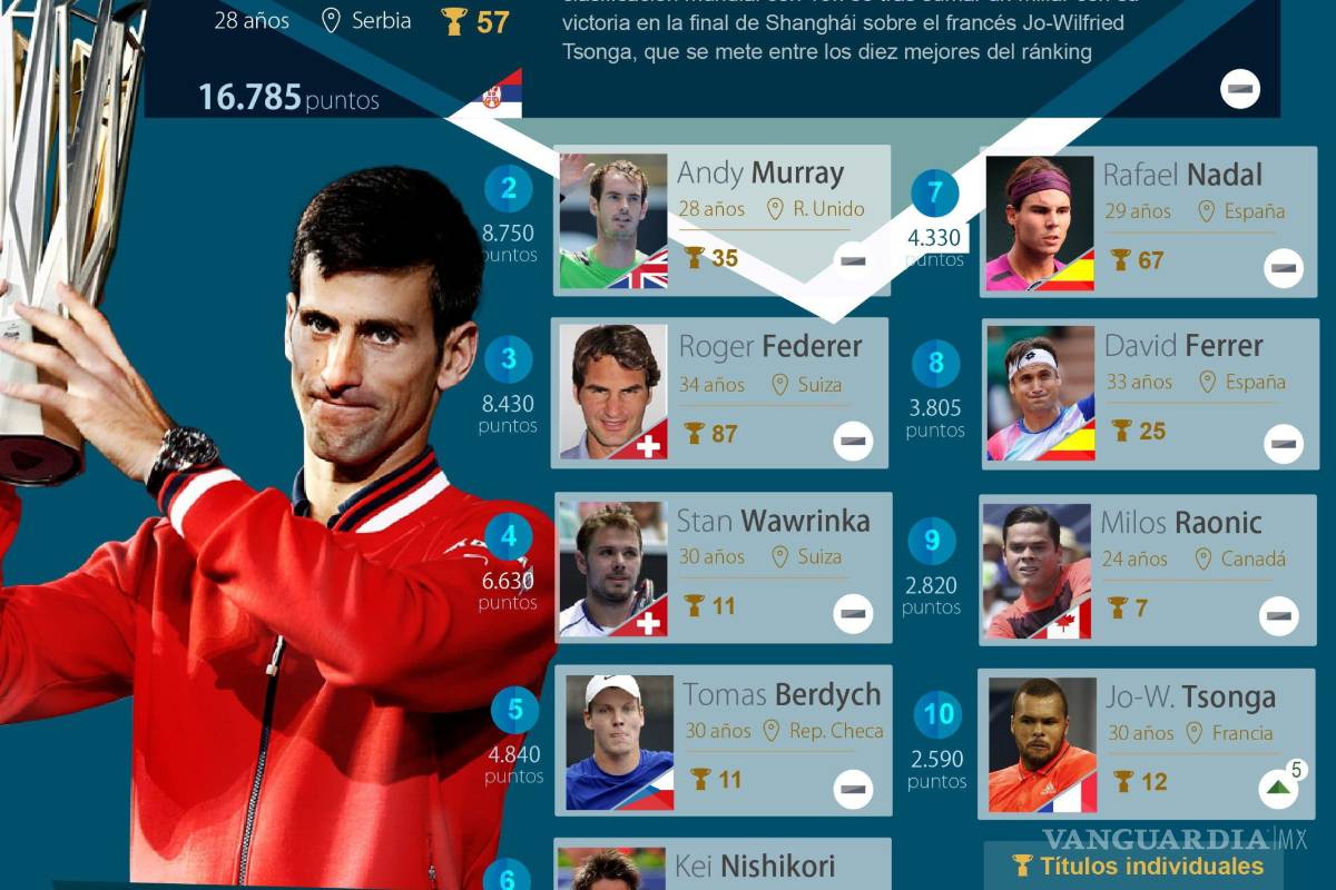 Después de ganar el Masters 1000 de Shanghái, el serbio Novak Djokovic rompió récord de puntos en la clasificación mundial de la Asociación de Tenistas Profesionales (ATP), al alcanzar 16 mil 785.