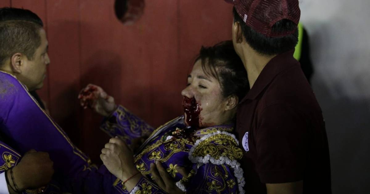 La matadora Hilda Tenorio es Golpeada por su toro al recibirlo con larga cambiada de hinojos, sufre fractura maxilar superior y laseracion de labio de 5cm parte izquierda hasta el ala de la nariz pic.twitter.com/LHlYcBf3Es