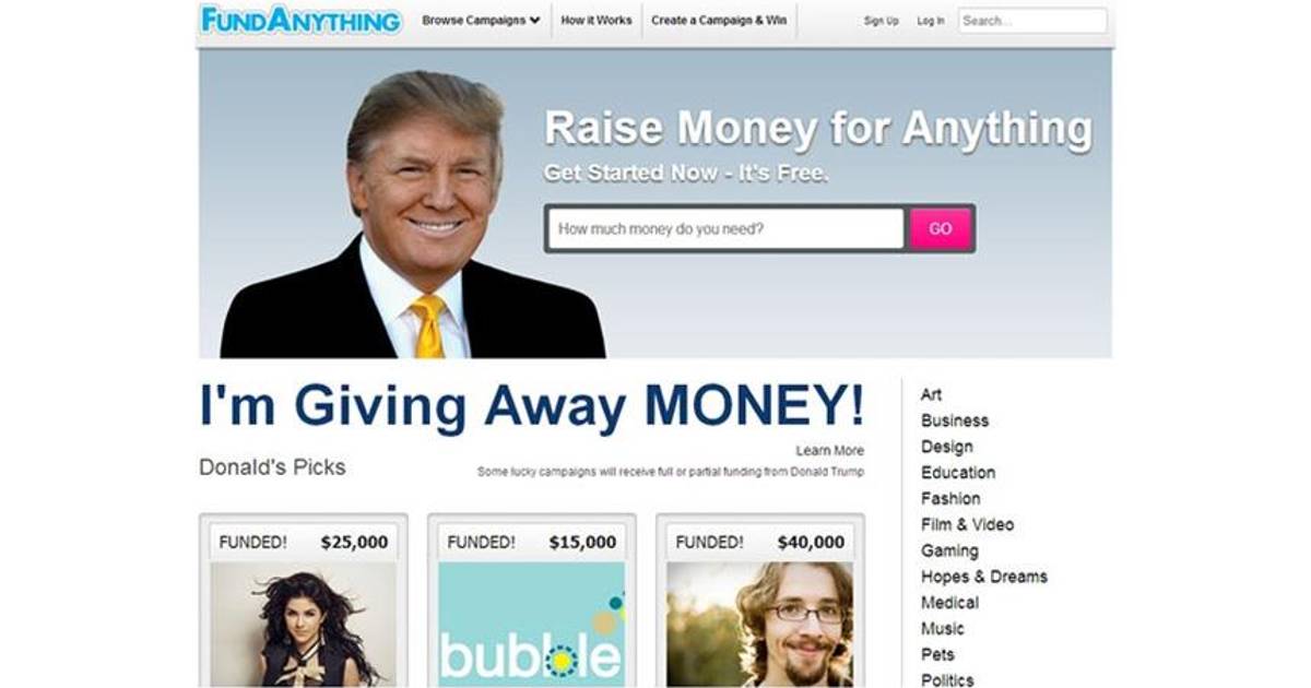 Trump será entonces quien también destine algo de dinero a esas financiaciones colectivas y adelantó que se hará cargo de completar el dinero faltante en los proyectos que considere meritorios.
