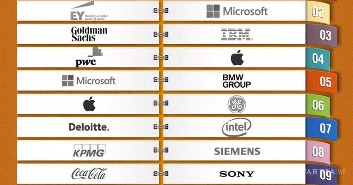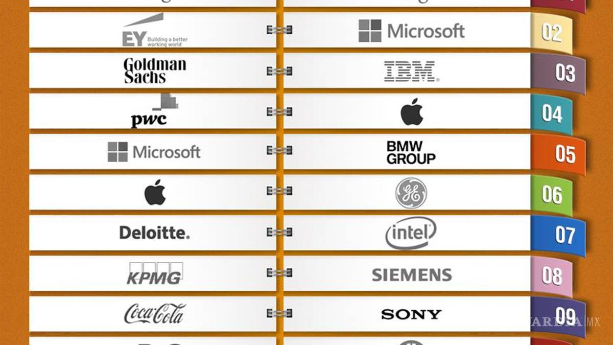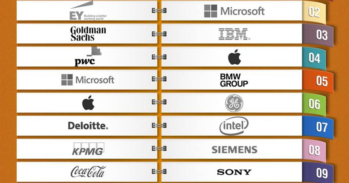 La clasificación empresarial 2013 muestra una fuerte competencia entre los servicios profesionales, la banca de inversión y las industrias de bienes de consumo de rápido movimiento. KPMG, posicionado como segundo contendiente del año pasado, ha bajado seis posiciones para ser reemplazado por EY (Ernst & Young), que subió cuatro peldaños.