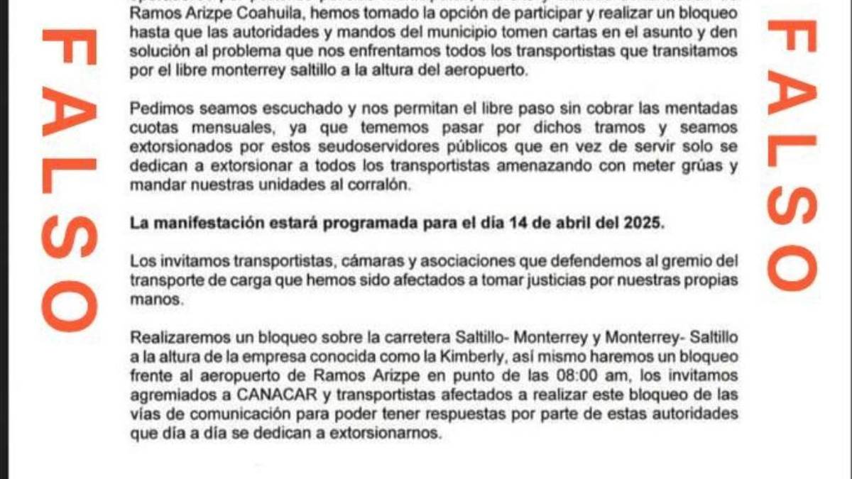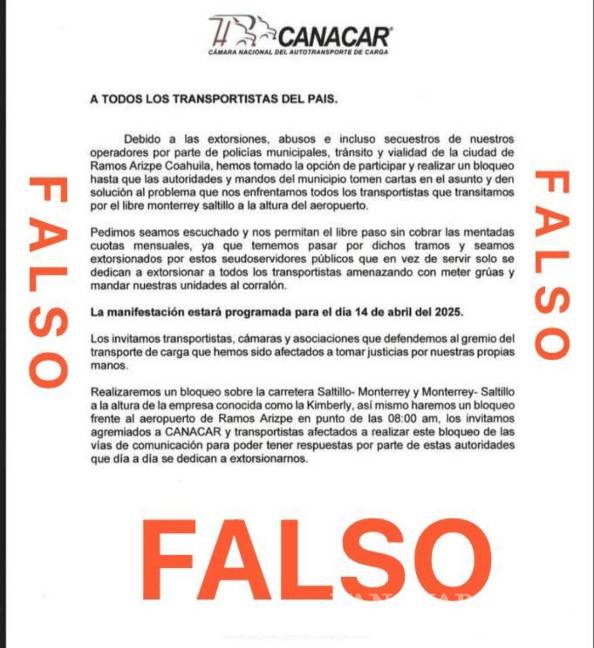 La Cámara Nacional del Autotransporte de Carga (Canacar) advirtió sobre un documento apócrifo que está circulando en las redes sociales y grupos de WhatsApp en la que informan sobre una manifestación para el 14 de abril como resultado de hechos delictivos ocurridos en Ramos Arizpe.