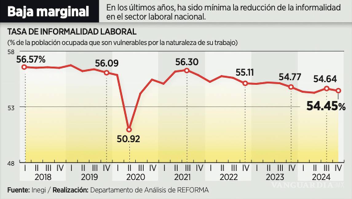 CIUDAD DE MÉXICO- En el Plan se advierte que entre 2018 y 2024 la informalidad laboral disminuyó apenas 1.9 puntos porcentuales, al pasar de 56.5 a 54.6 por ciento.