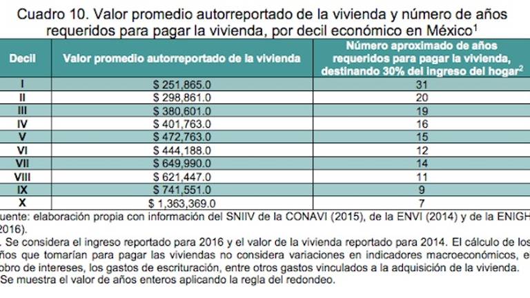 Para los casos de los deciles II, III, IV y V, los años aproximados para pagar una vivienda ascenderían a 20, 19, 16 y 15 años respectivamente, ello si contaran con el financiamiento requerido, mismo que resulta inexistente para las personas por debajo del VI decil económico.