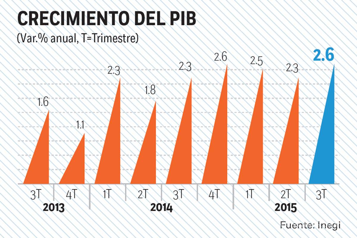 En el tercer trimestre de 2015, el Producto Interno Bruto (PIB) de México creció 2.6 por ciento anual, lo que significó su mayor avance en el mismo periodo de un año desde 2012, según cifras del Instituto Nacional de Estadística y Geografía (Inegi).