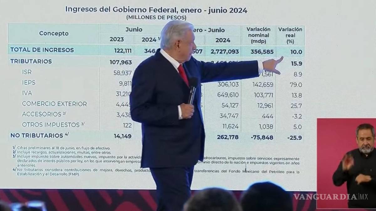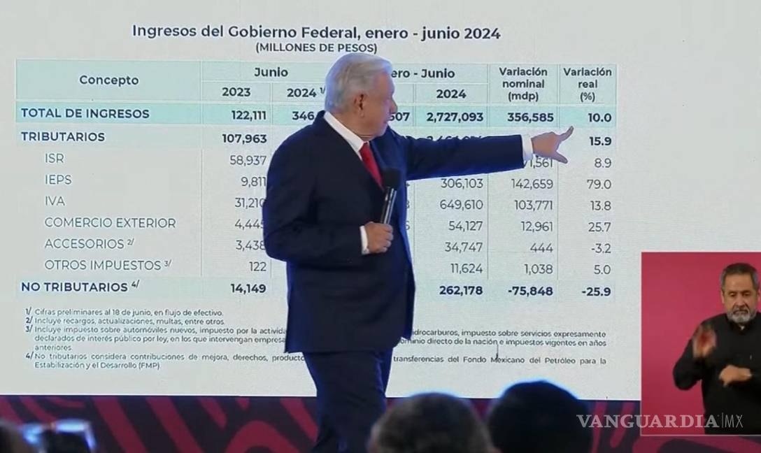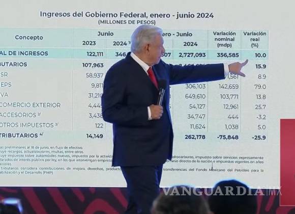 Utilizando un gráfico de la Secretaría de Hacienda y Crédito Público, el Mandatario resaltó que en el periodo de enero al 18 de junio se alcanzó una recaudación total de ingresos por 2 billones 727 mil 93 millones de pesos, un incremento de 356 mil 585 millones de pesos o del 10% real en comparación con el mismo lapso del año pasado.