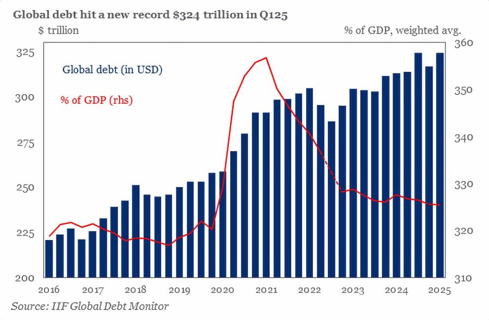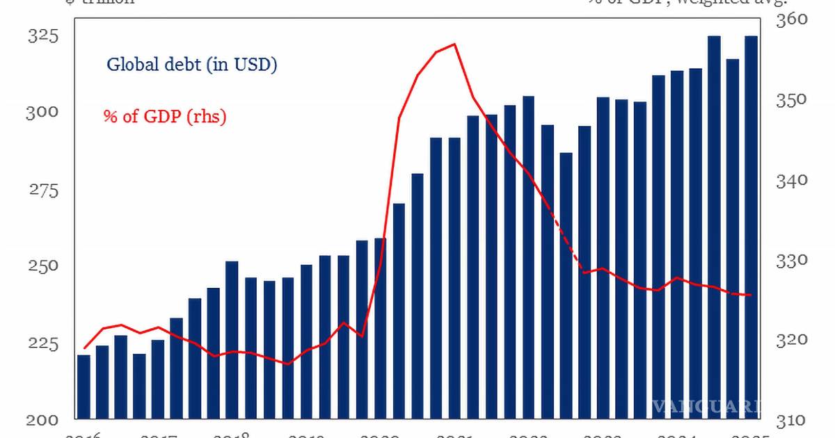 El Instituto de Finanzas Internacionales (IIF) precisó que la deuda global se elevó en el primer trimestre a los 324.3 billones de dólares, 7.5 billones más que hacen que supere el anterior récord de 324 billones alcanzado en el tercer trimestre de 2024