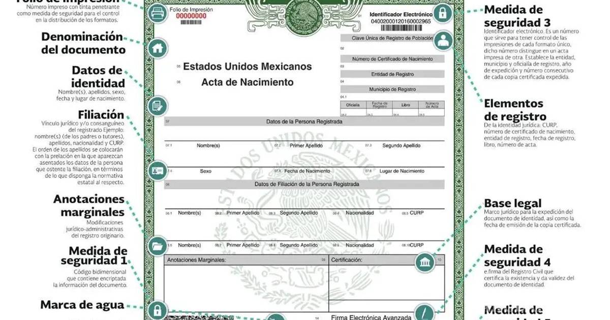 Indicador electrónico que limita el número de impresiones válidas por documento.Dato curioso: México es uno de los países en América Latina con un sistema de registro civil digital avanzado, lo que permite emitir actas de nacimiento certificadas desde cualquier parte del mundo.