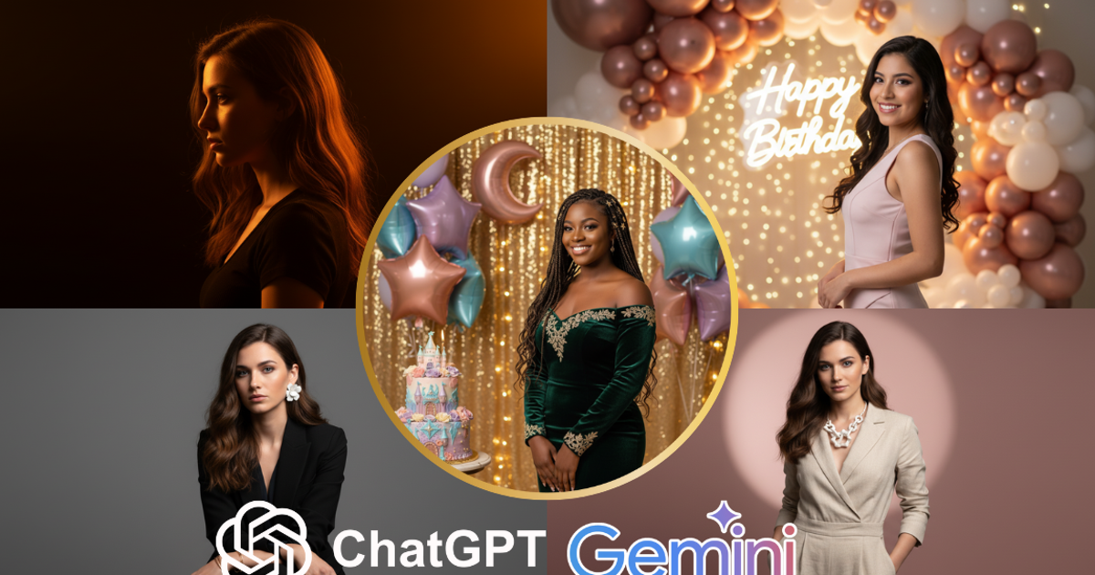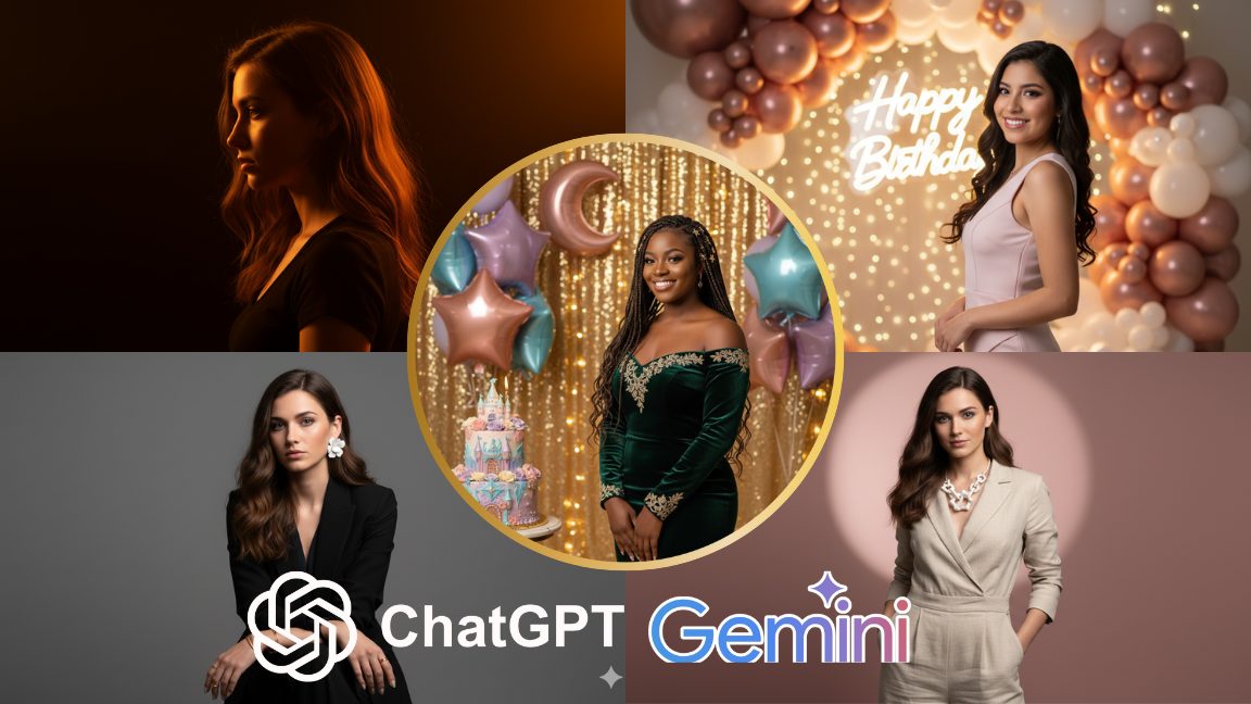 “Fotografía de estudio profesional de [Sujeto de la foto], posando frente a un elaborado fondo de cumpleaños. El fondo presenta una guirnalda de globos orgánicos en tonos [ej. ‘oro rosa, blanco y crema’] y un letrero de neón luminoso con la palabra ‘Happy Birthday’ o la edad. Iluminación suave y difusa de estudio para una piel impecable, con algunas luces bokeh brillantes y desenfocadas en el fondo. Detalles como confeti dorado esparcido sutilmente en el suelo. Composición de retrato de cuerpo entero o tres cuartos, enfoque nítido en el sujeto y el primer plano del fondo, profundidad de campo reducida. Estilo de fotografía de eventos de lujo, colores pastel y metálicos.”`
