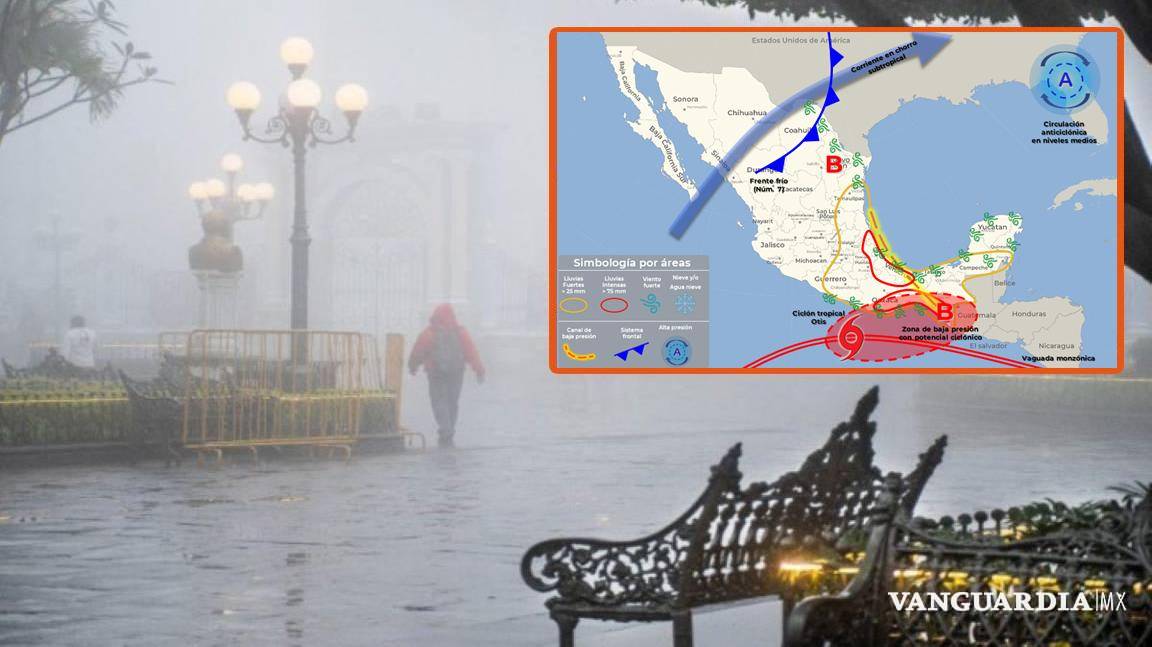 De miércoles a viernes, habrá interacción entre la tormenta tropical Otis que podría ingresar a tierra en Guerrero y una vaguada inducida en el Golfo de México, generando lluvias fuertes a torrenciales y avanzando de este a oeste.