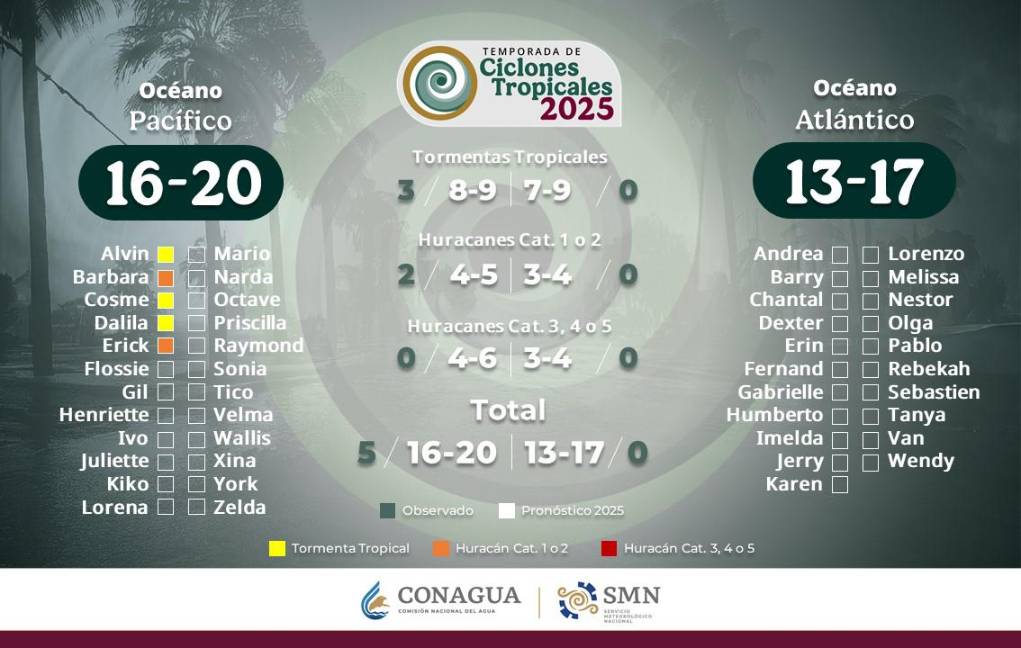 El SMN estima que durante esta temporada se podrían formar entre 16 y 20 ciclones tropicales en el océano Pacífico, por lo que el monitoreo y las medidas de prevención se mantendrán activas en los próximos meses.