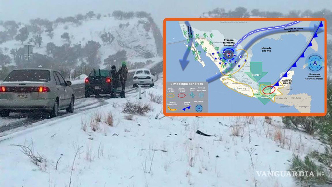 Por otro lado, la primera tormenta invernal se localizará sobre la Mesa del Norte, propiciará las condiciones para la caída de aguanieve o nieve en sierras de Chihuahua, Coahuila, Nuevo León, San Luis Potosí, Zacatecas y Durango, además de chubascos y lluvias fuertes a puntuales muy fuertes en entidades del norte y occidente de México.