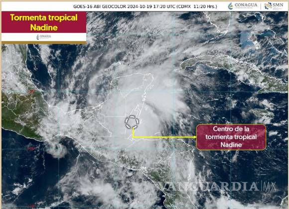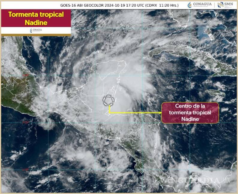 Se espera que el centro de la tormenta tropical Nadine toque tierra en el norte de Belice, aproximadamente a 70 km al sur de Chetumal, Quintana Roo, alrededor del mediodía de este sábado. Hasta el momento, la tormenta se localiza a unos 40 km al sureste de la Ciudad de Belice, Belice, a 140 km al sur-sureste de Chetumal, y a 160 km al sur de Puerto Costa Maya, en Quintana Roo.