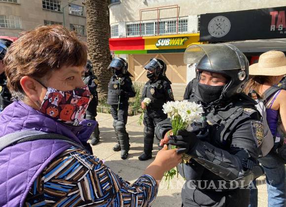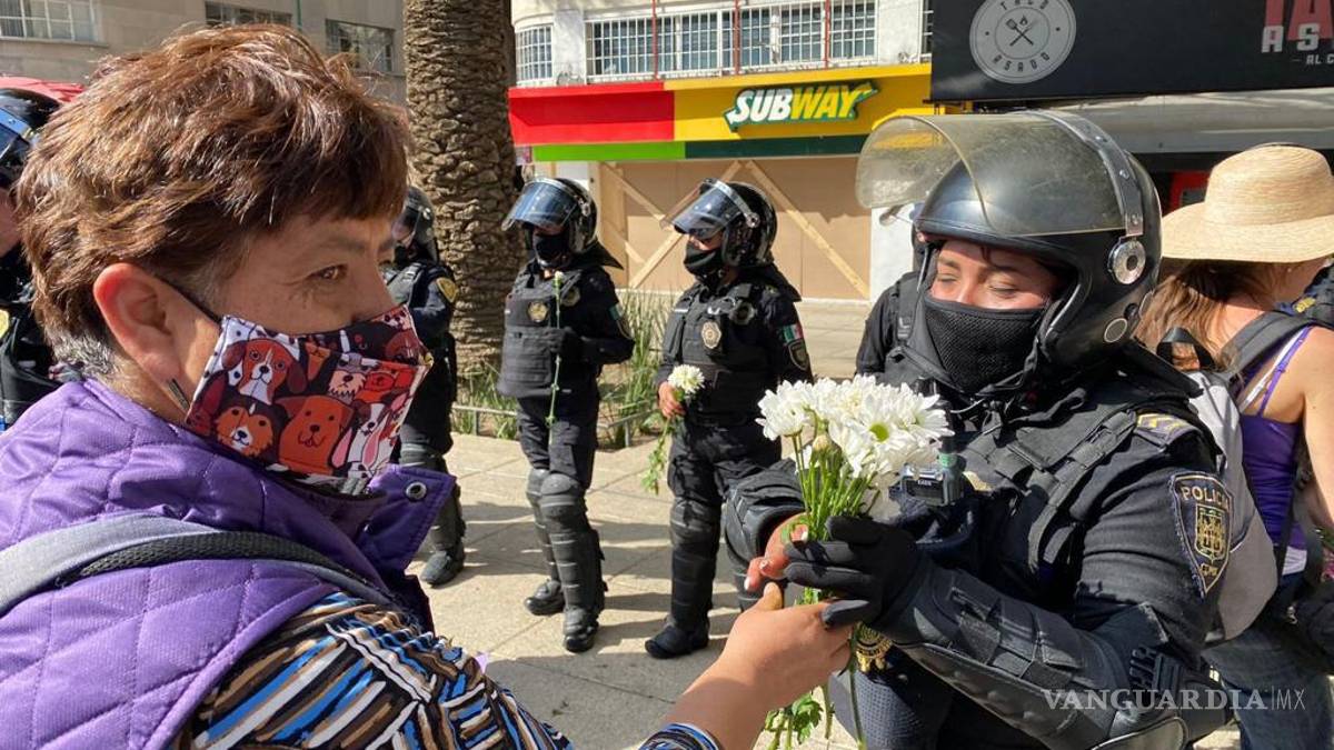 8M: Manifestantes regalan flores a mujeres policías en marcha de la CDMX