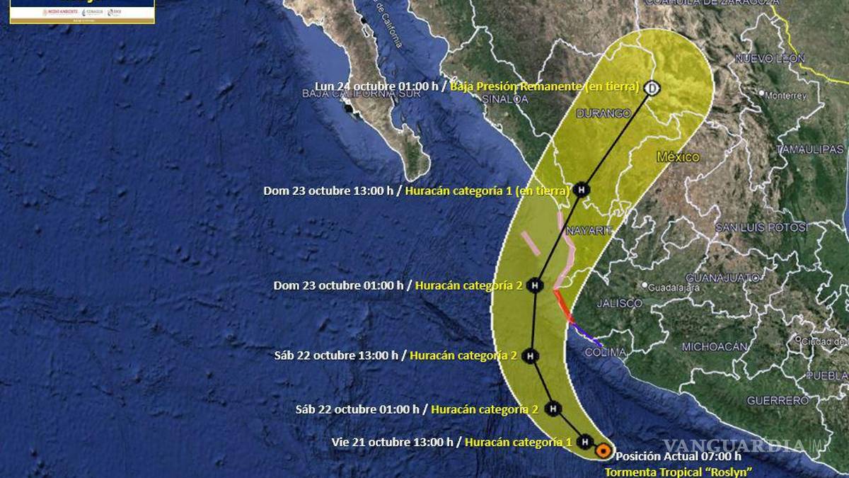 Este fin de semana, el ciclón Roslyn se convertirá en huracán y afectará varios estados de la costa del Pacífico de México, y tocará tierra en el el estado de Nayarit como categoría 1, ingresando al territorio mexicano y llegando hasta Coahuila el próximo lunes, ya degradado como baja presión remanente, esto según el pronóstico del Servicio Meteorológico Nacional de la Conagua.