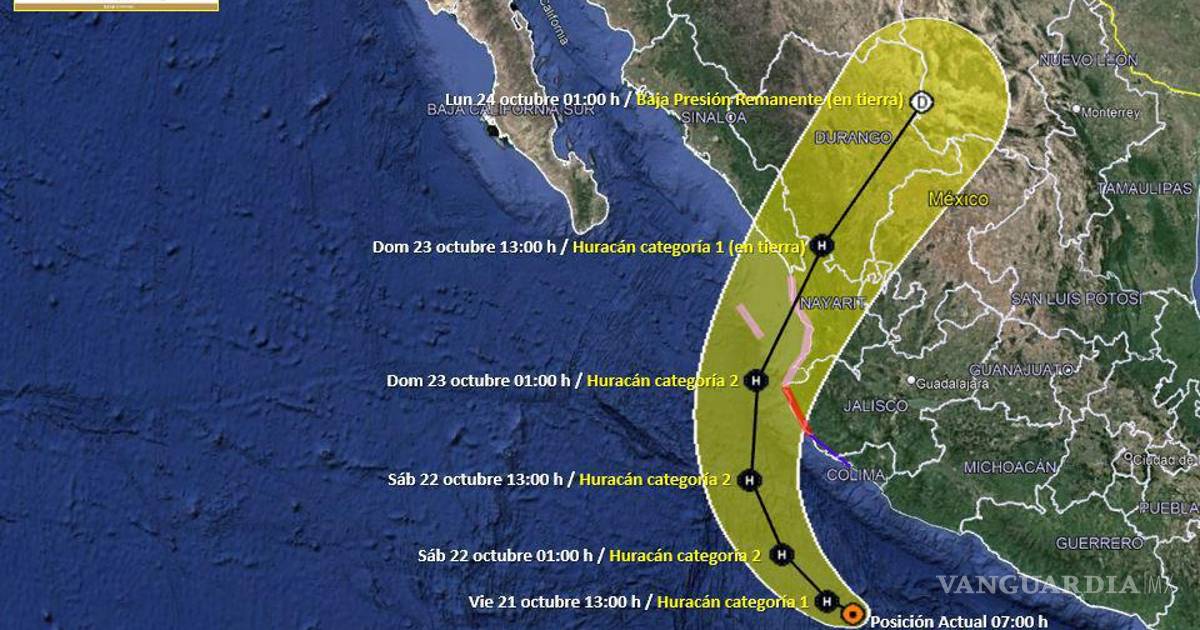 El domingo el huracán degradado a categoría 1 tocará tierra en Nayarit y avanzará dentro del territorio mexicano, atravesando el estado de Durango y arribando al estado de Coahuila la madrugada del lunes ya como baja presión remanente, generando fuertes lluvias en el estado.