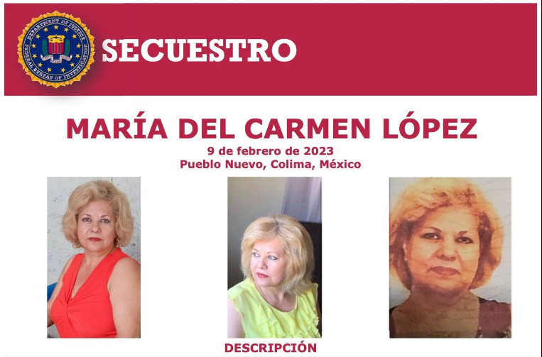 Se trata de María del Carmen López, privada de su libertad en su residencia, el pasado 9 de febrero del presente año. Al momento, el FBI ofrece una recompensa de hasta 20 mil dólares a quienes tengan datos que lleve a su localización.
