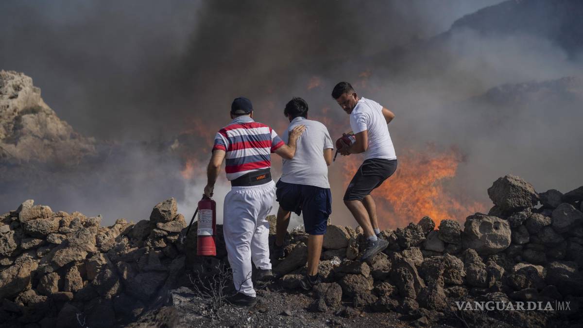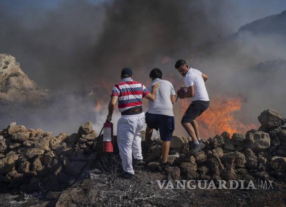 A medida que se acercaban las llamas, turistas en un hotel junto al mar en la isla griega de Rodas recogían cubos de agua de la piscina y toallas mojadas o corrían a ayudar al personal y los vecinos a extinguir uno de los incendios forestales que amenazaban las localidades en el Mediterráneo durante las olas de calor recientes.