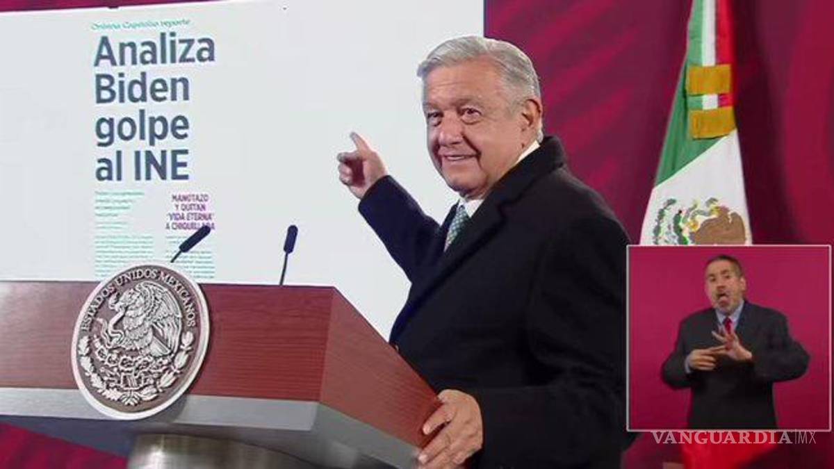 “Fíjense, ‘Analiza Biden golpe al INE’, probresitos los que leen y le creen al REFORMA, ¿Ustedes creen, hablando en plata, que analiza Biden, el Presidente Biden, el golpe al INE?, Ustedes creen que Biden, jajajajajaja, el Presidente Biden primero es muy respetuoso de las decisiones que nosotros tomamos, sabe que México es un país independiente, soberano, libre, es un político con mucha experiencia, tiene asuntos, ya parece que le va a estar importando lo que piense Junco o Chumel o Denisse, pero es interesante eso, ‘Analiza Biden golpe al INE’, ¿Ustedes creen que el Presidente de Estados Unidos tiene en su agenda eso? Ni sabe”, tronó el Mandatario.
