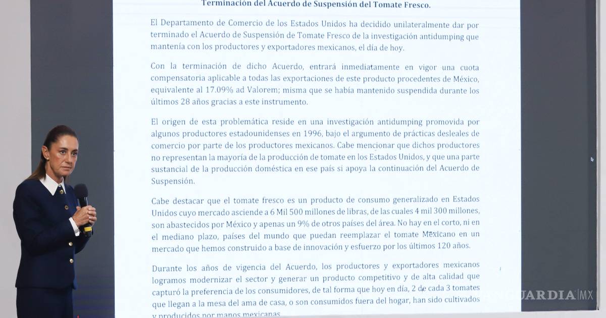 Como en los aranceles generales y en otros productos, Sheinbaum dijo que la cuota compensatoria que Estados Unidos impone al tomate perjudicará en mayor medida a sus consumidores, pues es “muy difícil” sustituirlo.