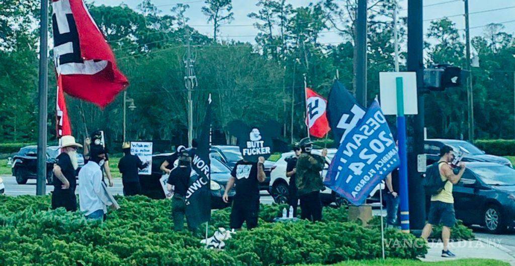 Al menos una decena de simpatizantes de Ron DeSantis, gobernador de Florida y candidato republicano por la contienda presidencial de Estados Unidos en 2024, apoyaron al político ondeando la bandera nazi, a las afueras del parque temático de Walt Disney World.