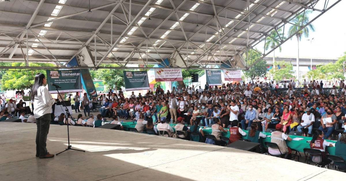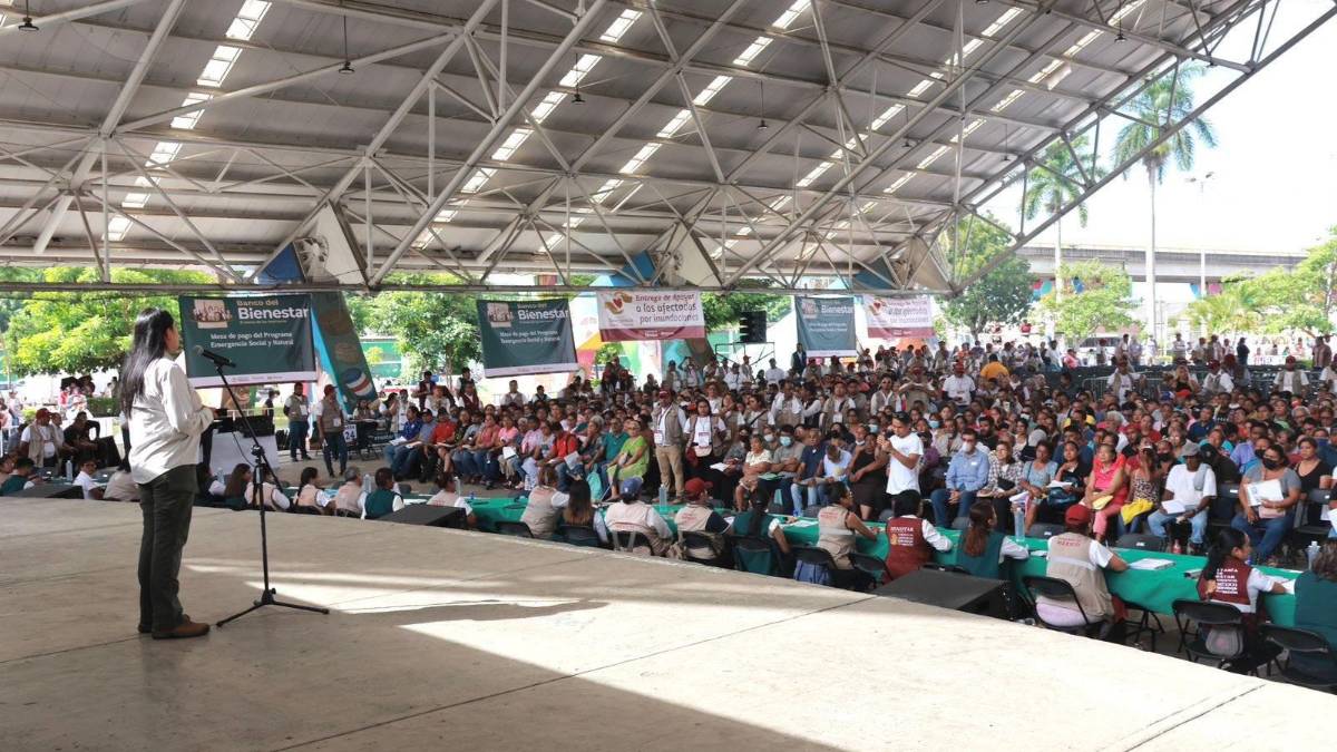La titular de la Secretaría de Bienestar, Ariadna Montiel Reyes, encabezó el inicio de la entrega de recursos económicos, vales y enseres domésticos para afectados por inundaciones