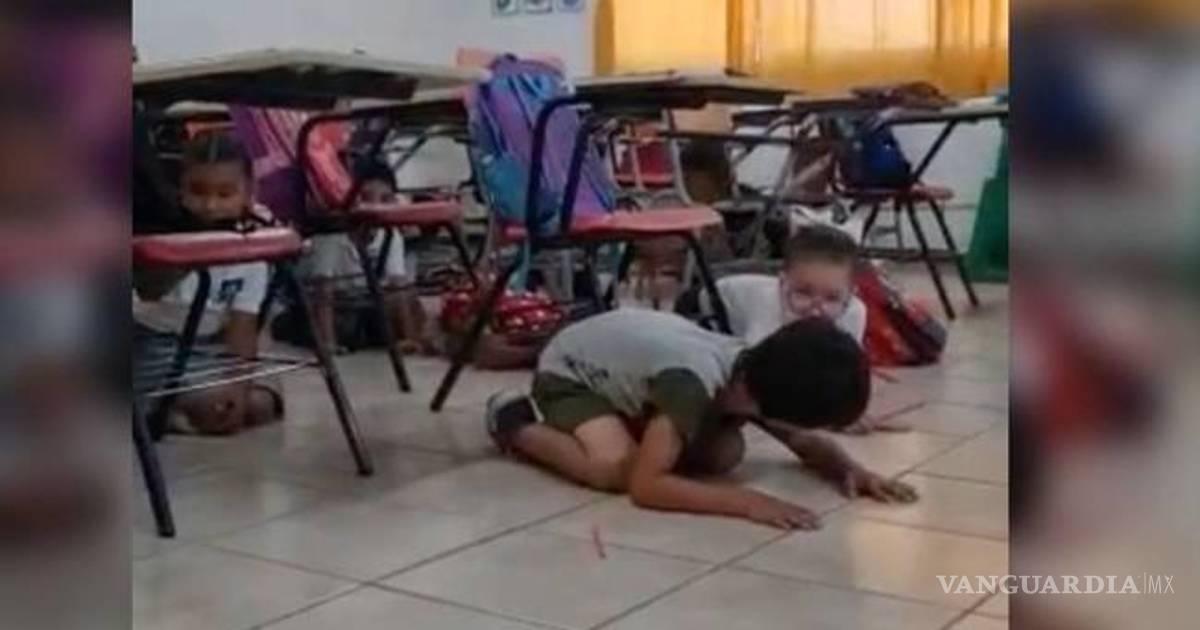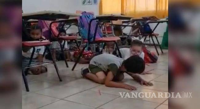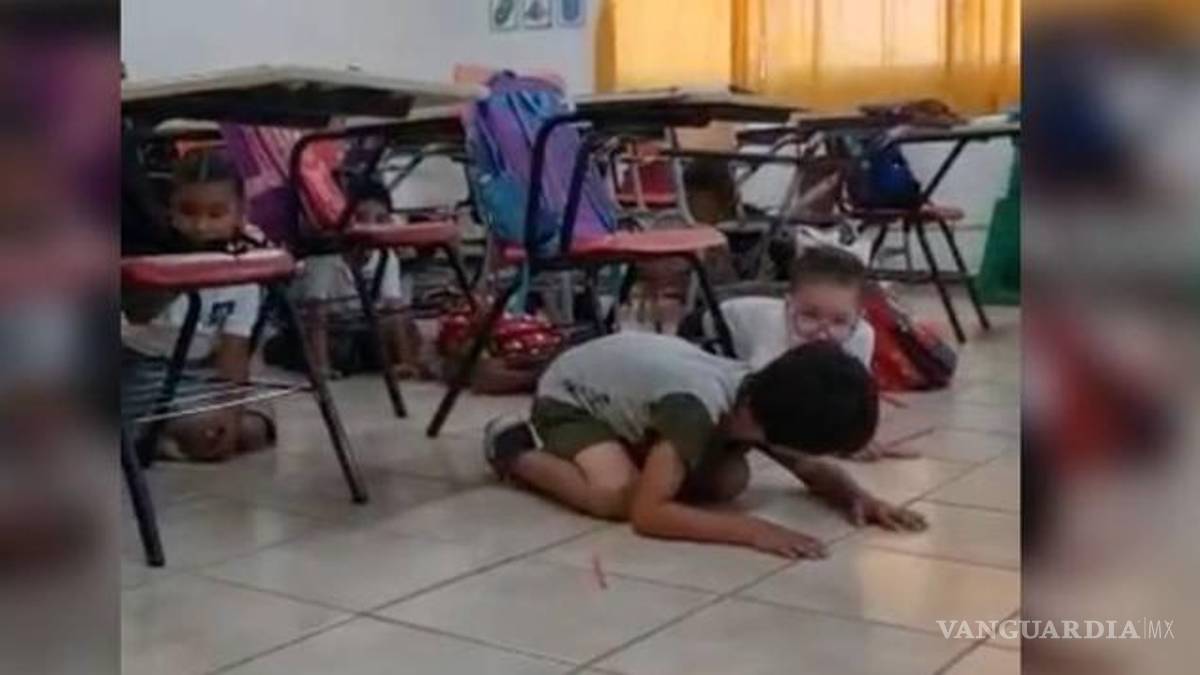 En el video se le escucha a la maestra pedir a los niños que mantengan la calma y permanezcan agachados, mientras se observa a los pequeños seguir sus instrucciones.