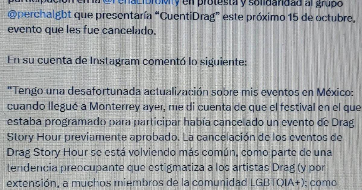 “Tengo una desafortunada actualización sobre los eventos que se van a dar en México. Cuando llegué ayer a Monterrey me di cuenta de que el festival para el que yo estaba agendada participar había cancelado un evento de Drag Story Hour previamente aprobado”, publicó en sus redes sociales.