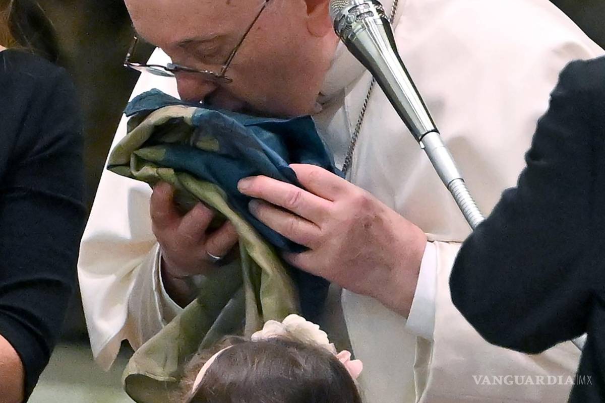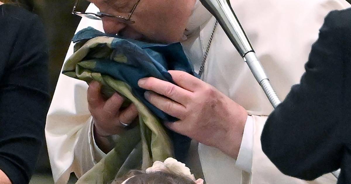 El papa la besó y dijo: “Esta bandera viene de la guerra, de la martirizada ciudad de Bucha... No los olvidemos. No olvidemos al pueblo de Ucrania”.
