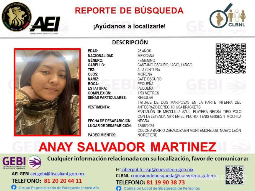 Anay, vista por última vez el 13 de agosto en la colonia Barrio Zaragoza, es de tez morena, con cabello largo castaño oscuro, y tiene un tatuaje de dos mariposas en el antebrazo