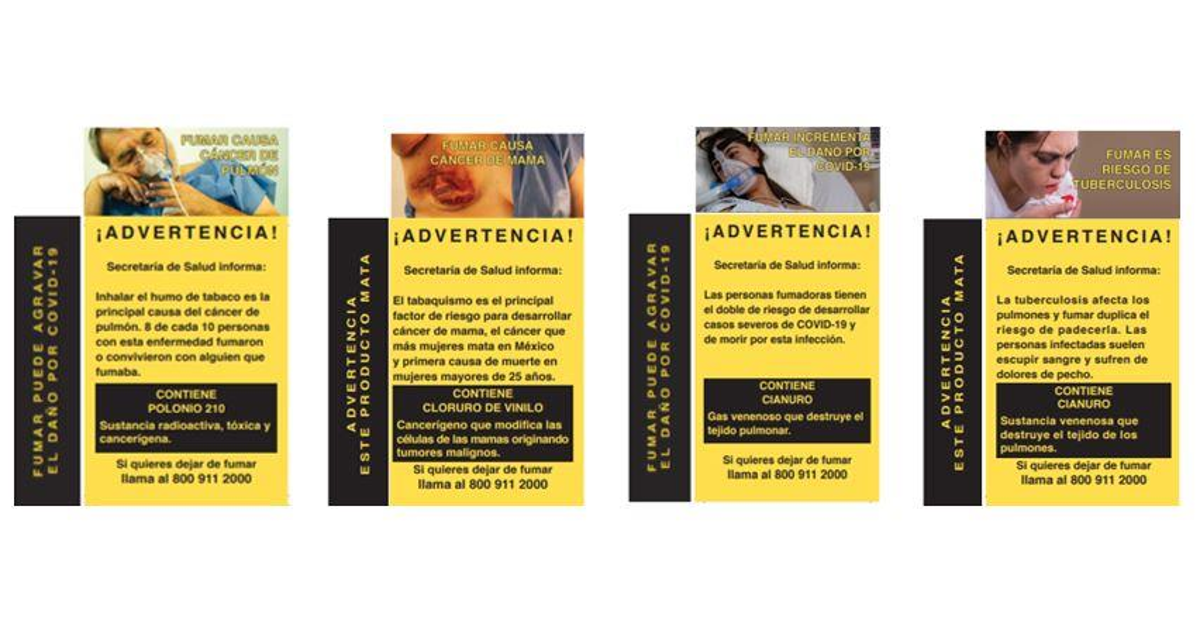 El acuerdo señala que todos los productos de tabaco que se fabriquen, produzcan, importen o comercialicen en México deben traer impresos estos mensajes sanitarios y pictogramas.