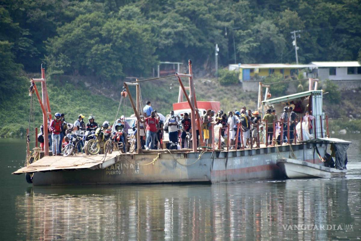 En La Corcordia se ve a cientos de migrantes trepados en El Chalán, una plataforma que transporta camiones, mercancía y gente del pueblo en la presa La Angostura, donde sólo el sábado por la noche pasaron más de 350 migrantes.